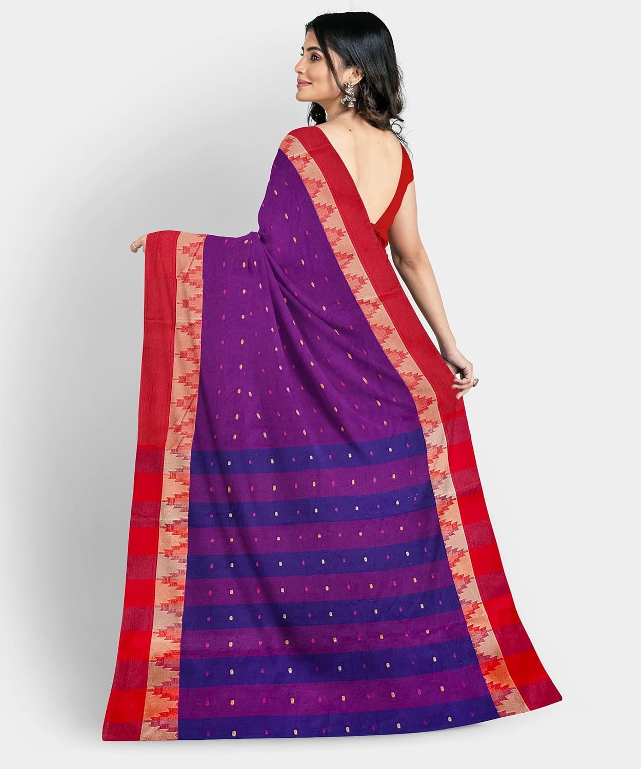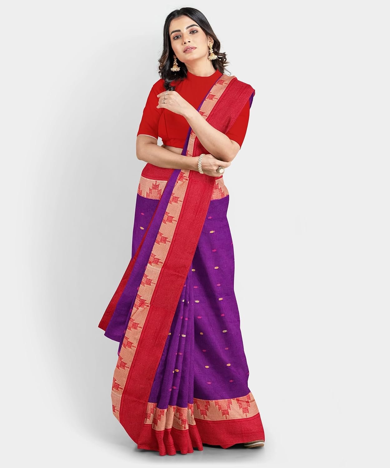 Women’s Traditional Bengal Tant Pure Cotton Tant Saree Without Blouse Piece Color purple and red