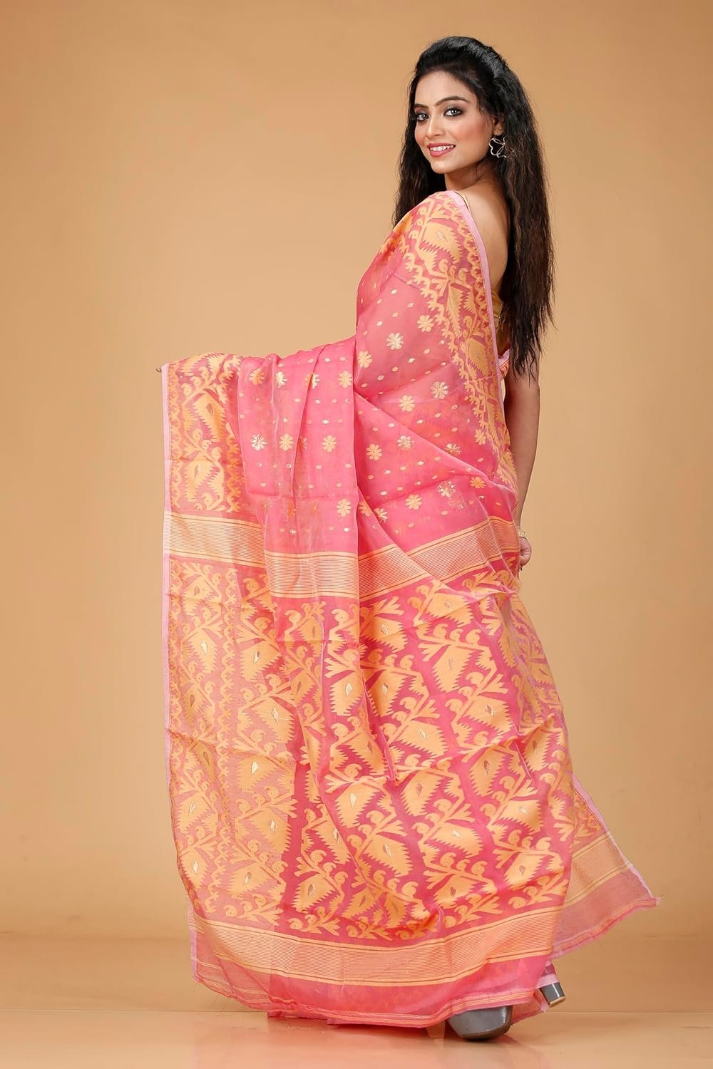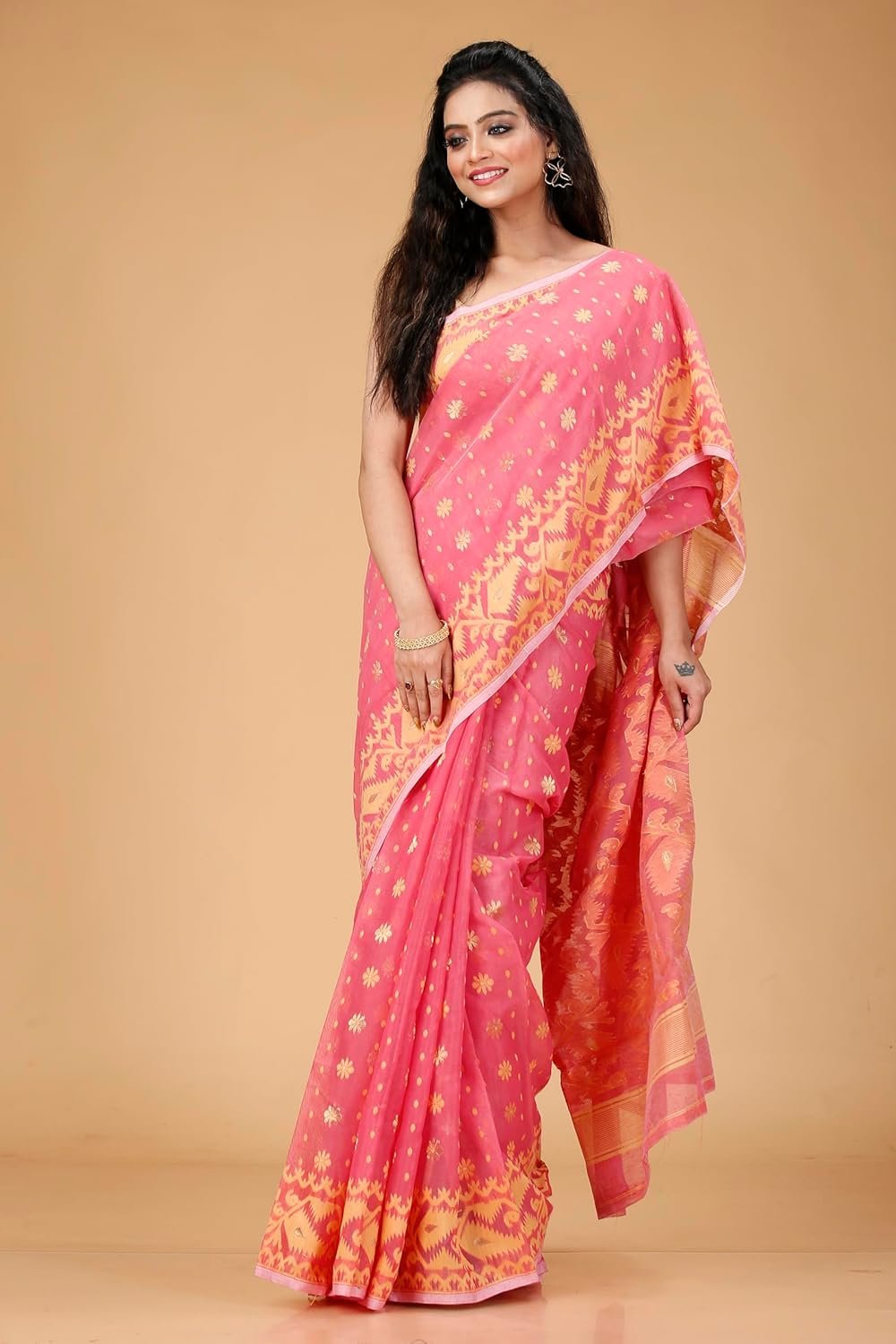 Women’s Dhakai Jamdani Bengal Pure Cotton Handloom Saree without Blouse Piece colour pink and golden
