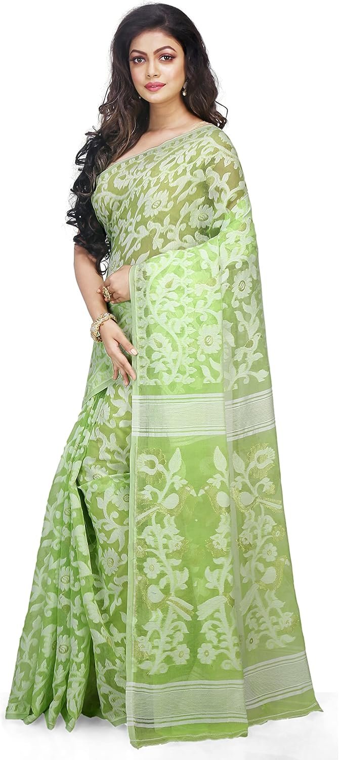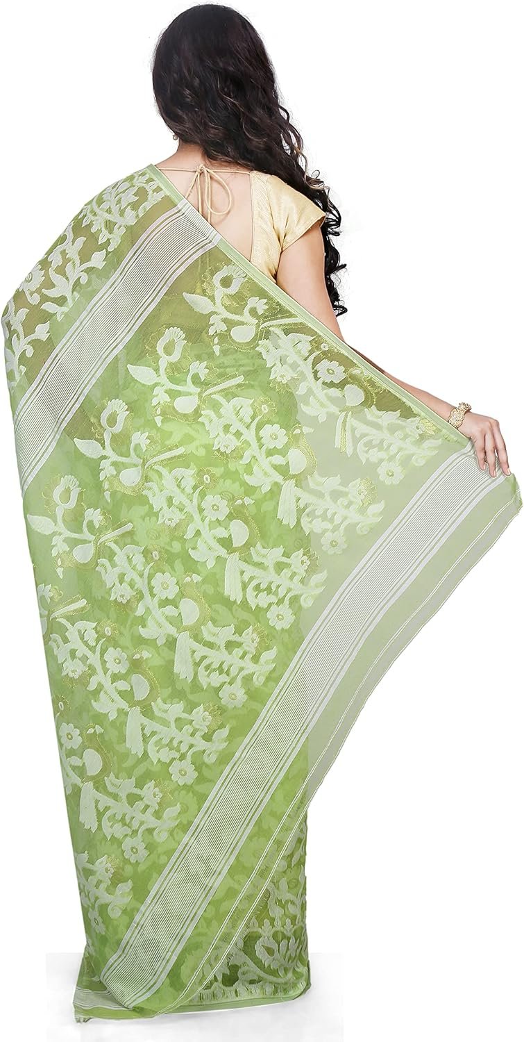 Women’s Dhakai Jamdani Bengal Pure Cotton Handloom Saree without Blouse Piece colour light green