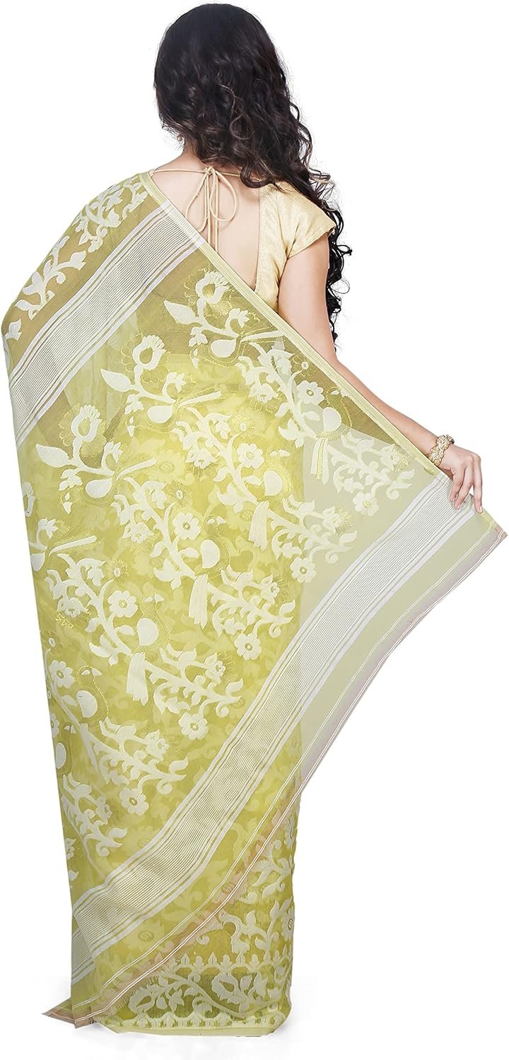 Women’s Dhakai Jamdani Bengal Pure Cotton Handloom Saree without Blouse Piece colour lemon yellow