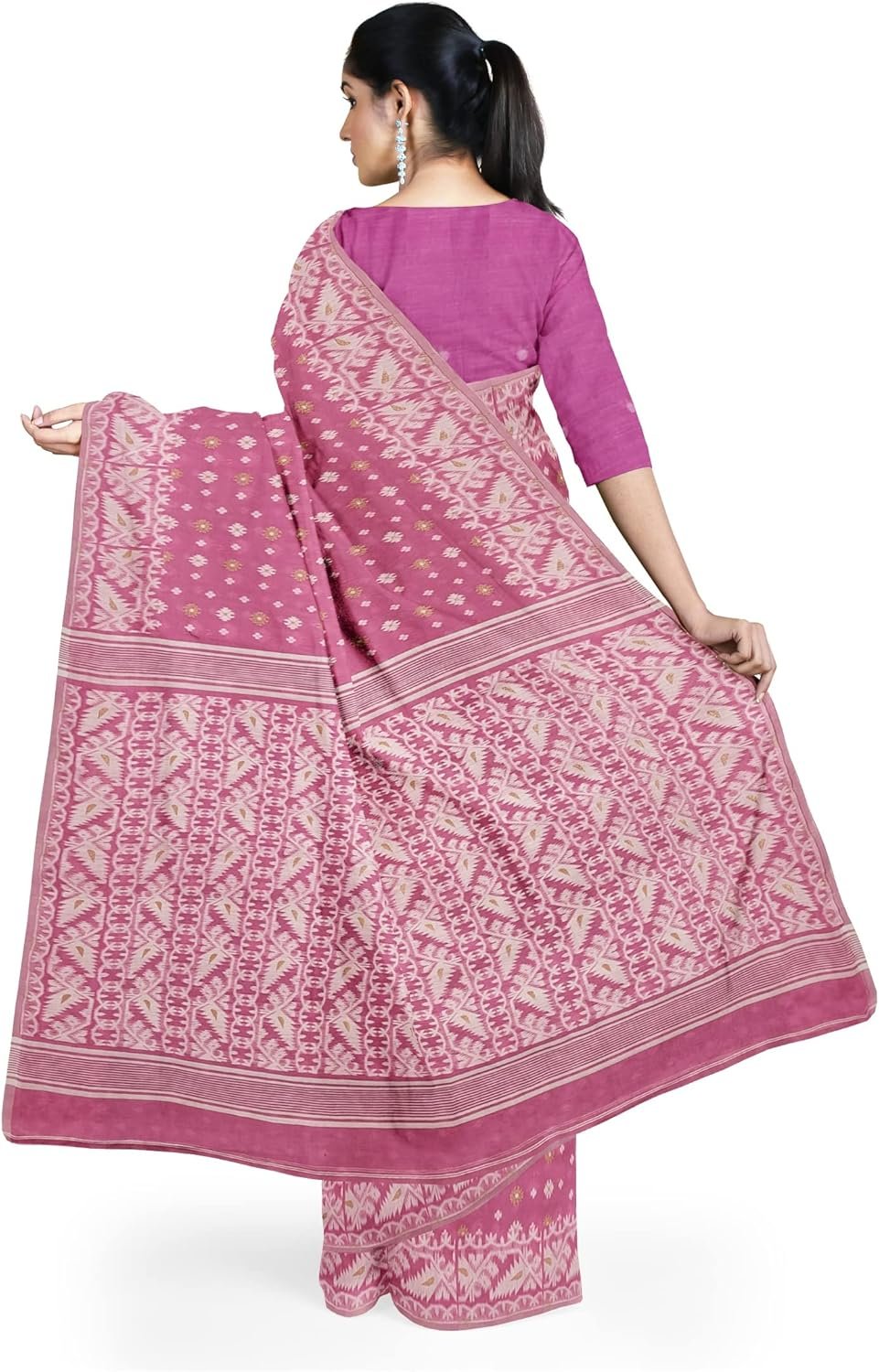 Women’s Dhakai Jamdani Bengal Pure Cotton Handloom Saree without Blouse Piece colour pink