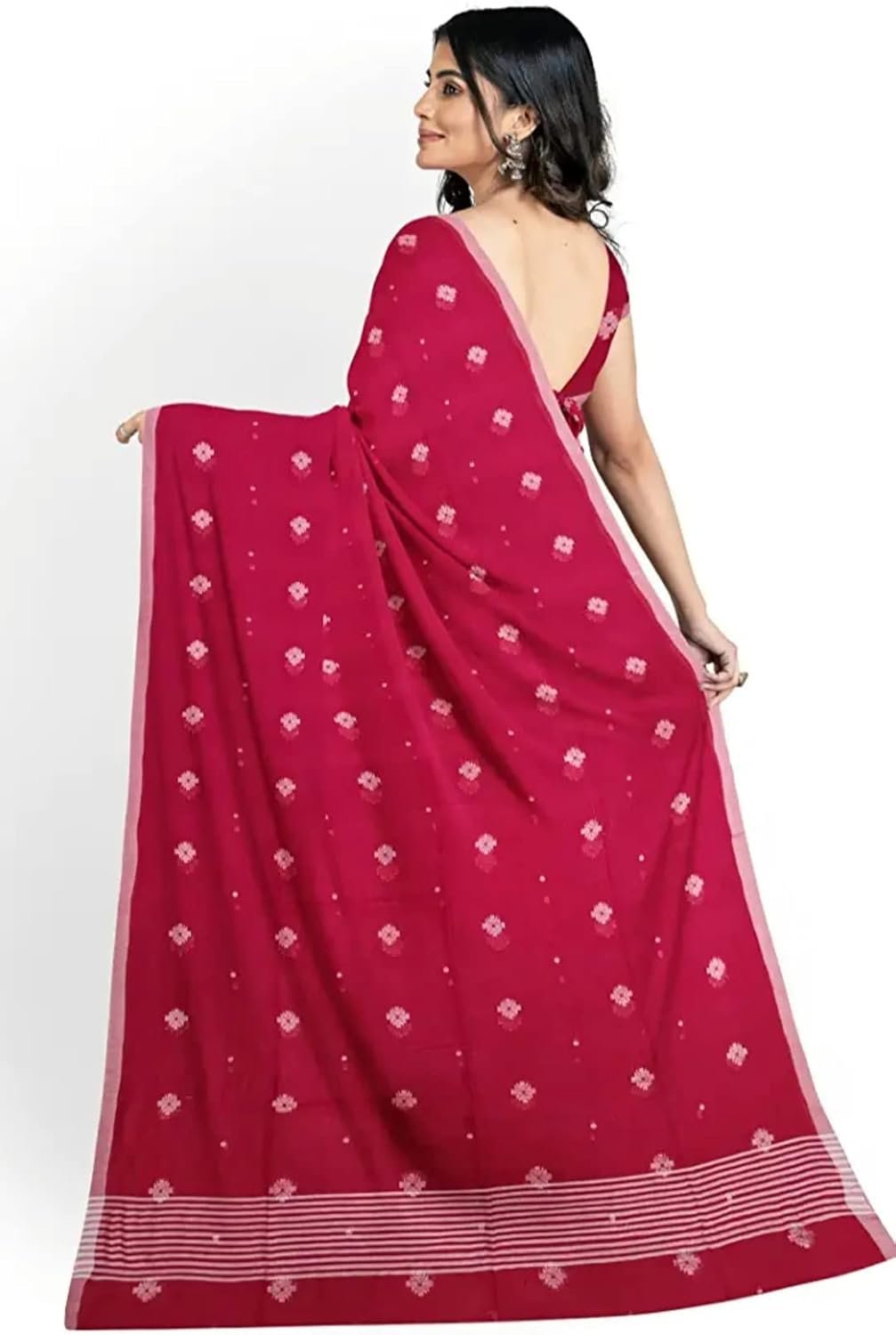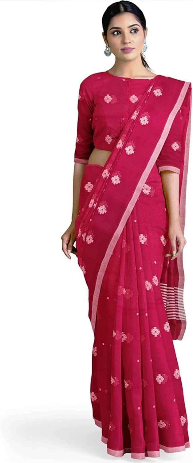 Women’s Dhakai Jamdani Bengal Pure Cotton Handloom Saree without Blouse Piece colour red
