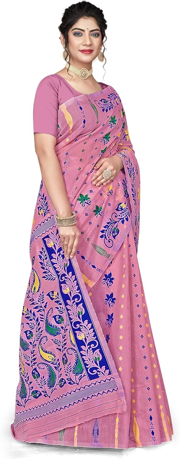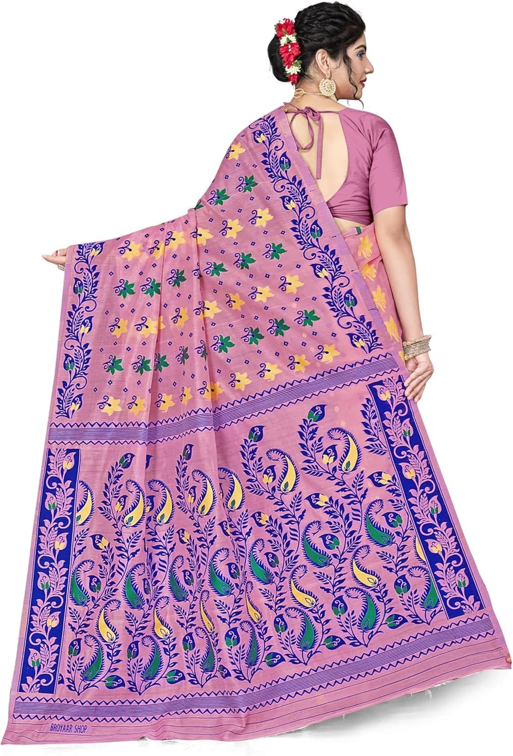 Women’s Dhakai Jamdani Bengal Pure Cotton Handloom Saree without Blouse Piece colour baby pink