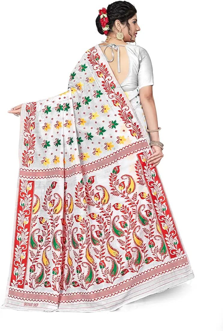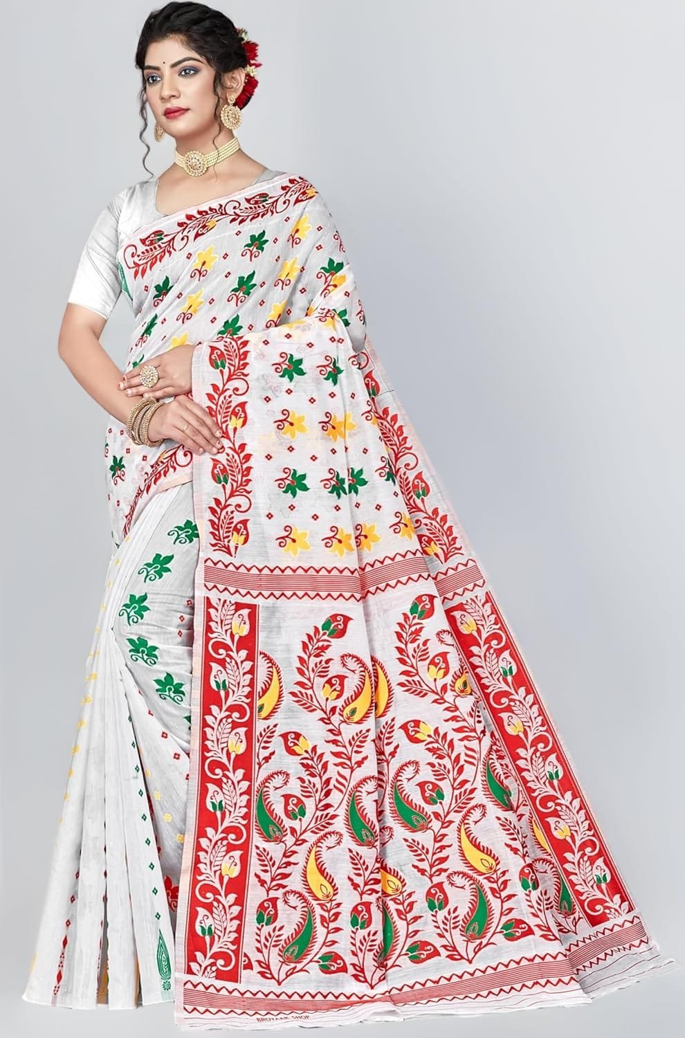 Women’s Dhakai Jamdani Bengal Pure Cotton Handloom Saree without Blouse Piece colour white with red, green, and yellow accents in the floral and paisley patterns