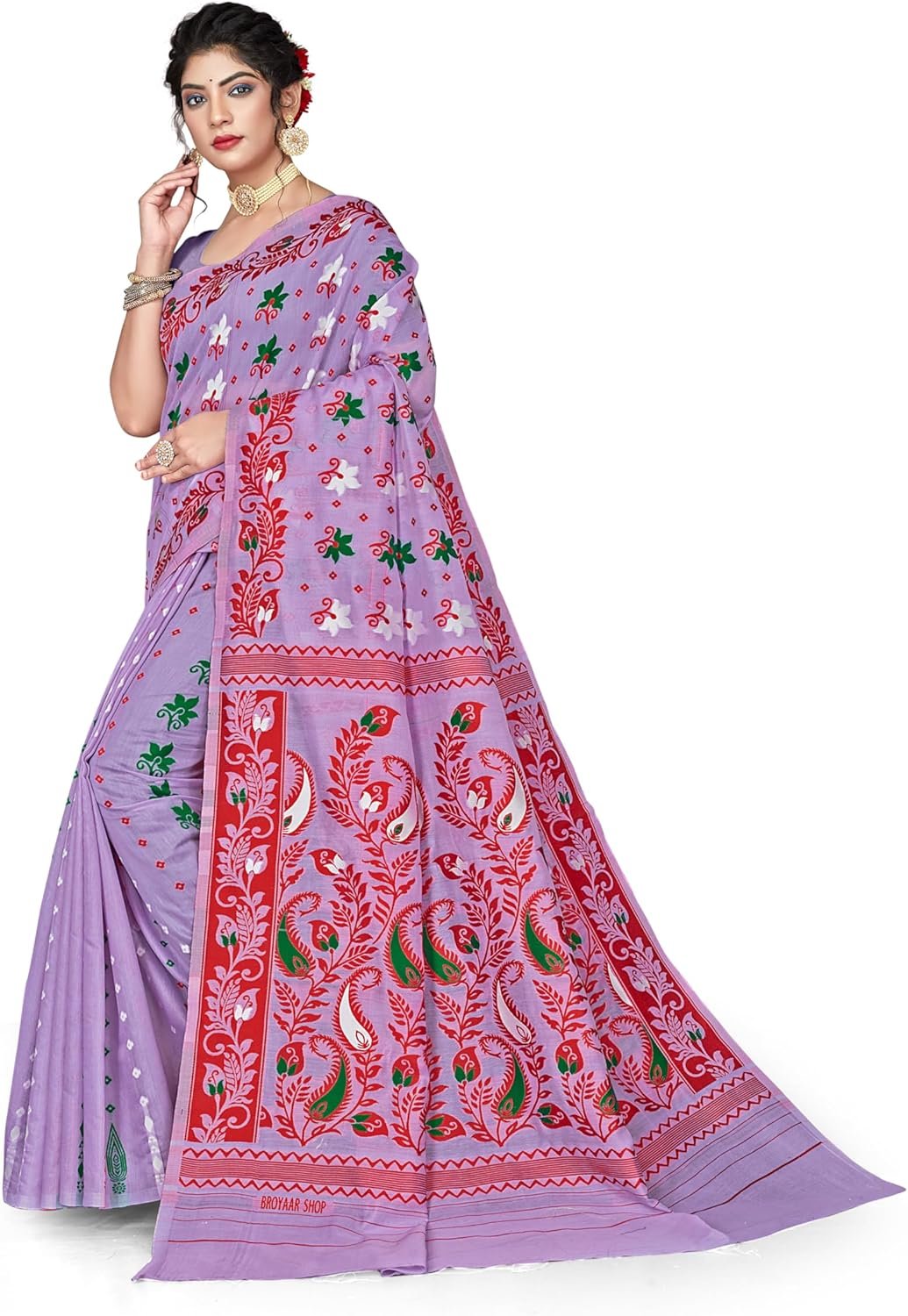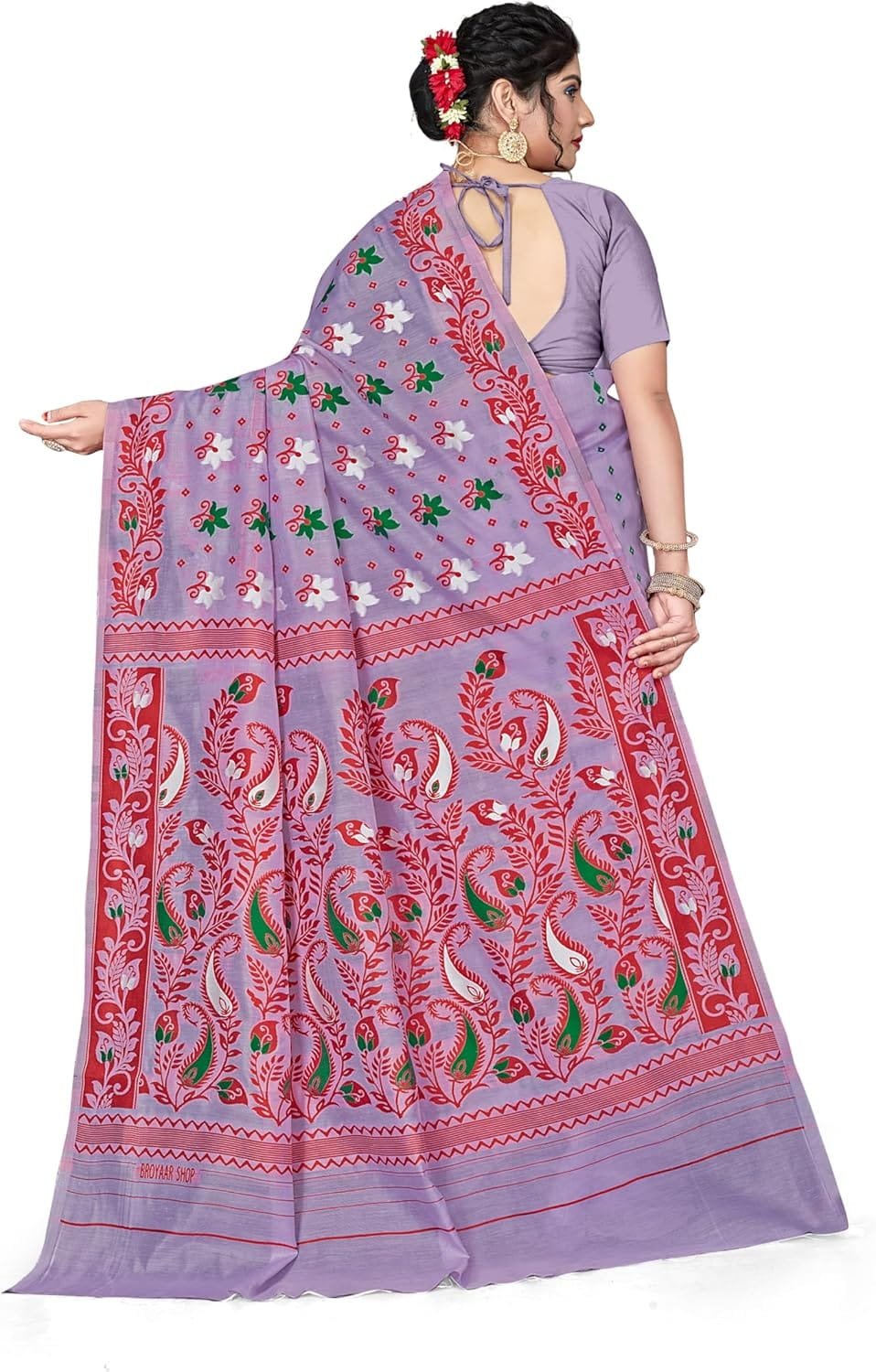 Women’s Dhakai Jamdani Bengal Pure Cotton Handloom Saree without Blouse Piece colour light purple, often referred to as lavender