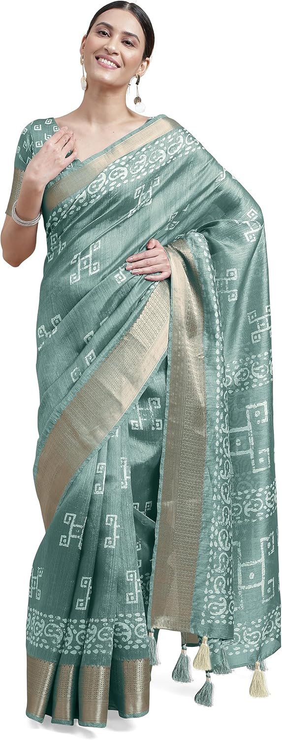 Women’s Cotton Silk Blend Block Printed Saree with Blouse Piece colour teal (blue-green)