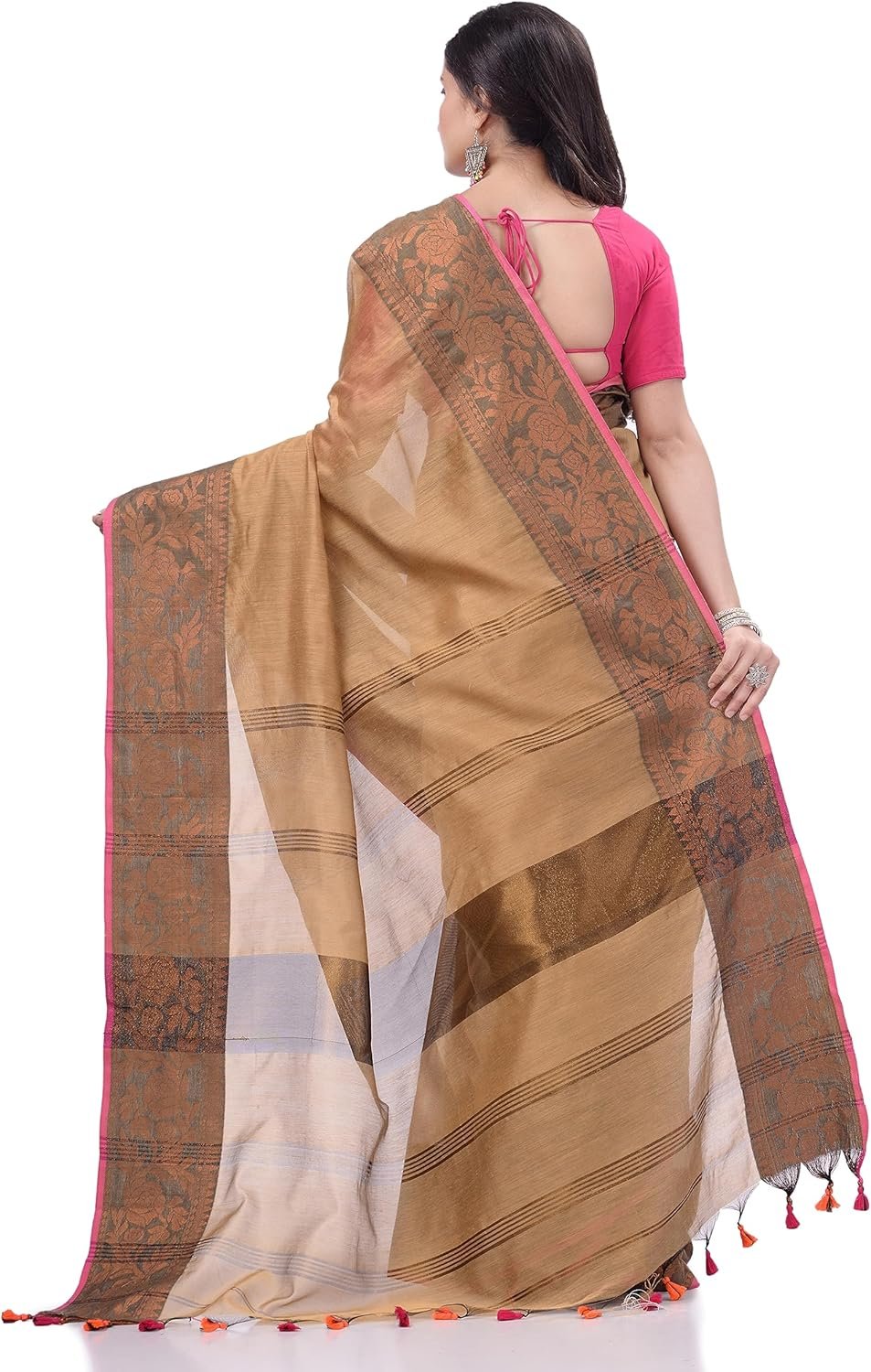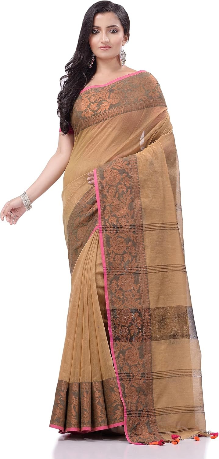 Women’s Dhakai Jamdani Bengal Pure Cotton Handloom Saree without Blouse Piece colour golden