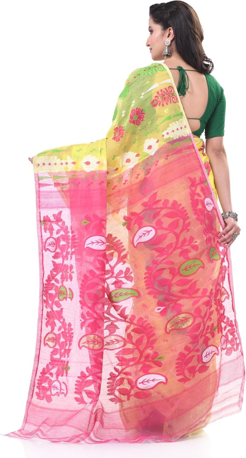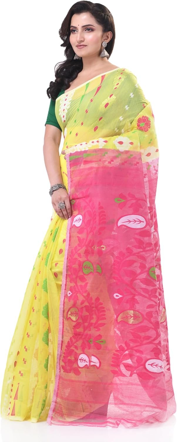 Women’s Dhakai Jamdani Bengal Pure Cotton Handloom Saree without Blouse Piece colour yellow and pink