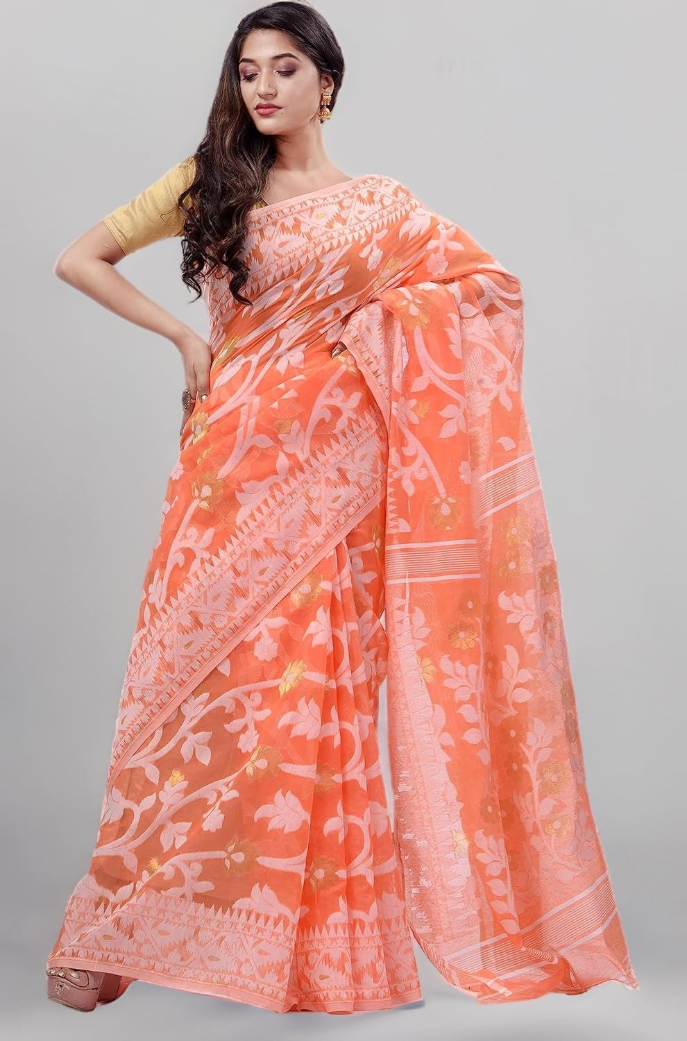 Women’s Dhakai Jamdani Bengal Pure Cotton Handloom Saree without Blouse Piece colour orange