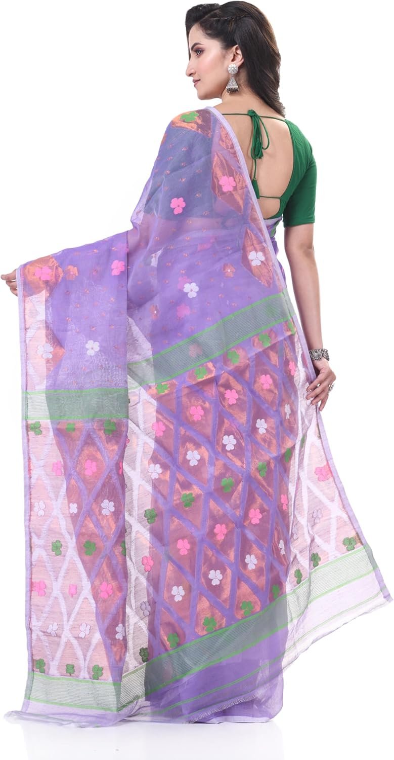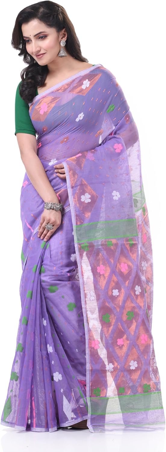 Women’s Dhakai Jamdani Bengal Pure Cotton Handloom Saree without Blouse Piece colour violet