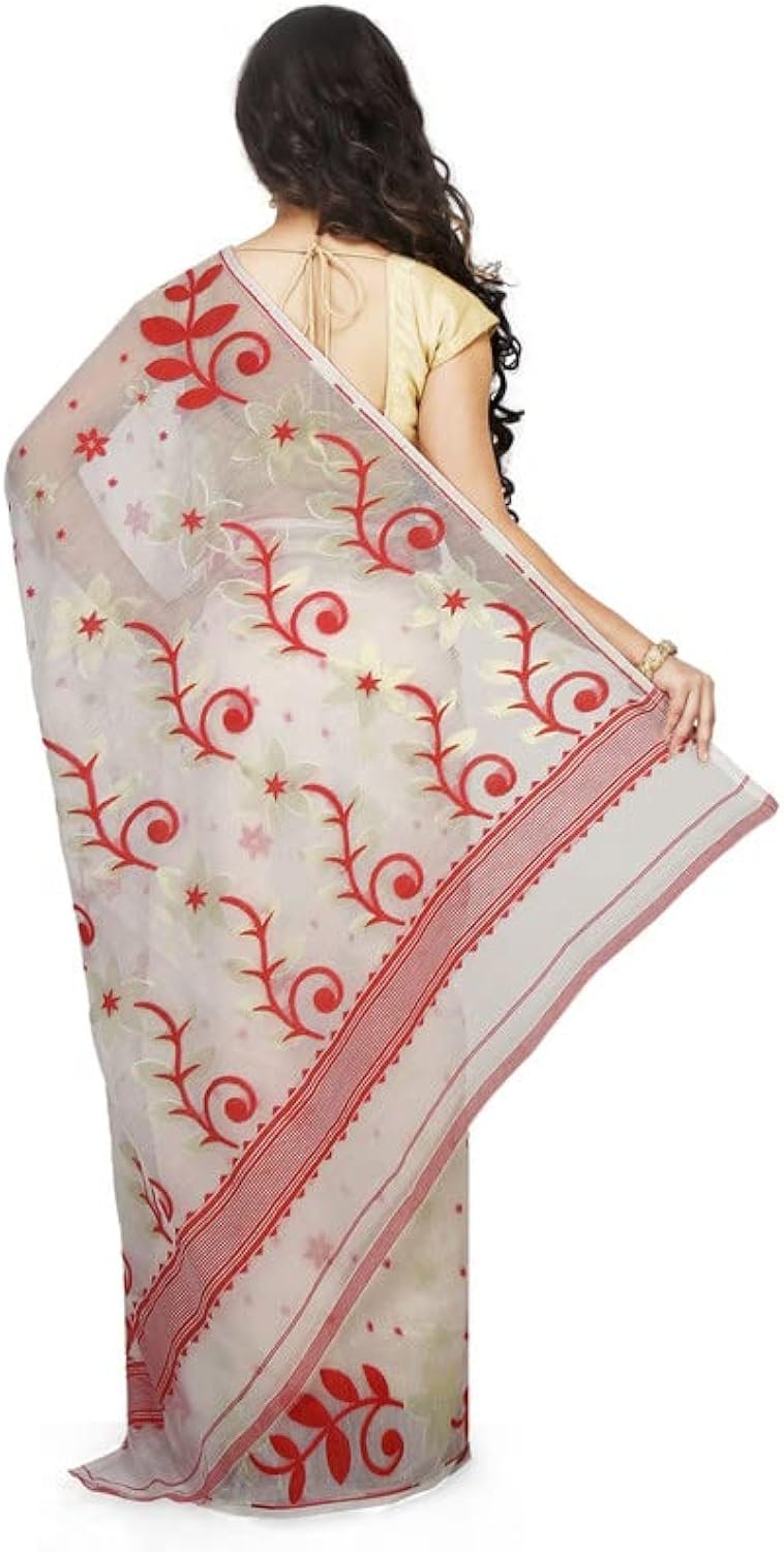 Women’s Dhakai Jamdani Bengal Pure Cotton Handloom Saree without Blouse Piece colour white and red