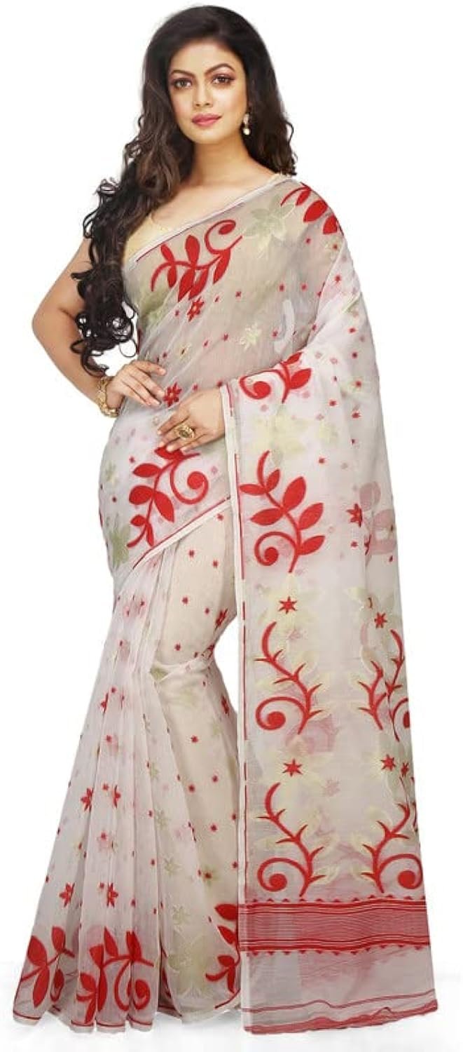 Women's Dhakai Jamdani Bengal Pure Cotton Handloom Saree without Blouse Piece colour white and  redWomen’s Dhakai Jamdani Bengal Pure Cotton Handloom Saree without Blouse Piece colour white and red