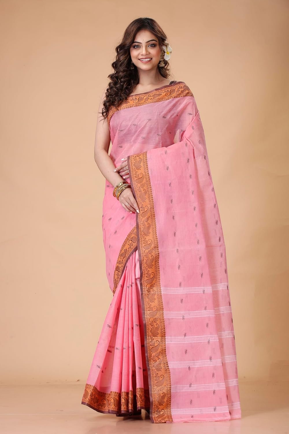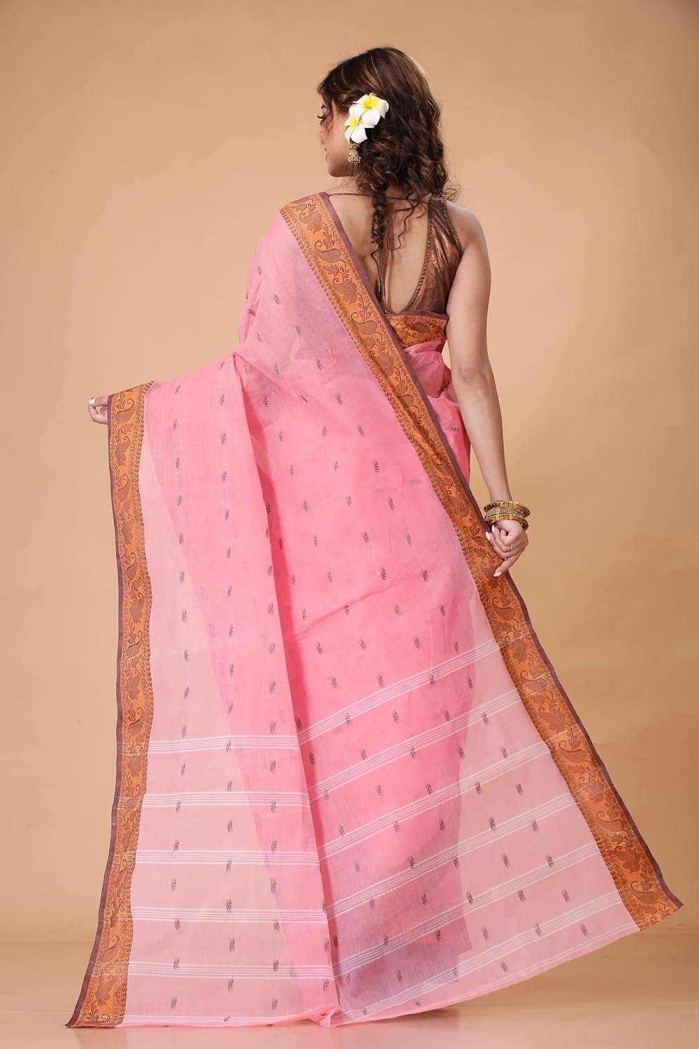 Women’s Traditional Bengal Tant Pure Cotton Tant Saree Without Blouse Piece Color light blue with golden peach pink