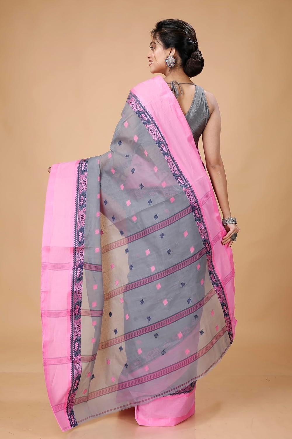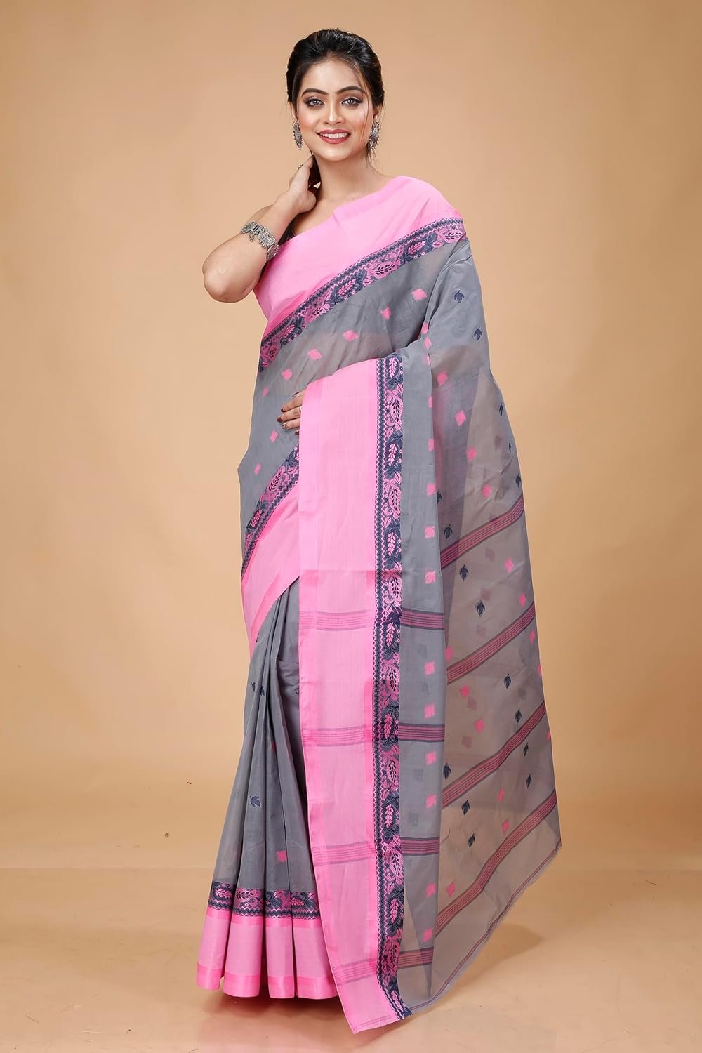 Women’s Traditional Bengal Tant Pure Cotton Tant Saree Without Blouse Piece Color grey with a pink border